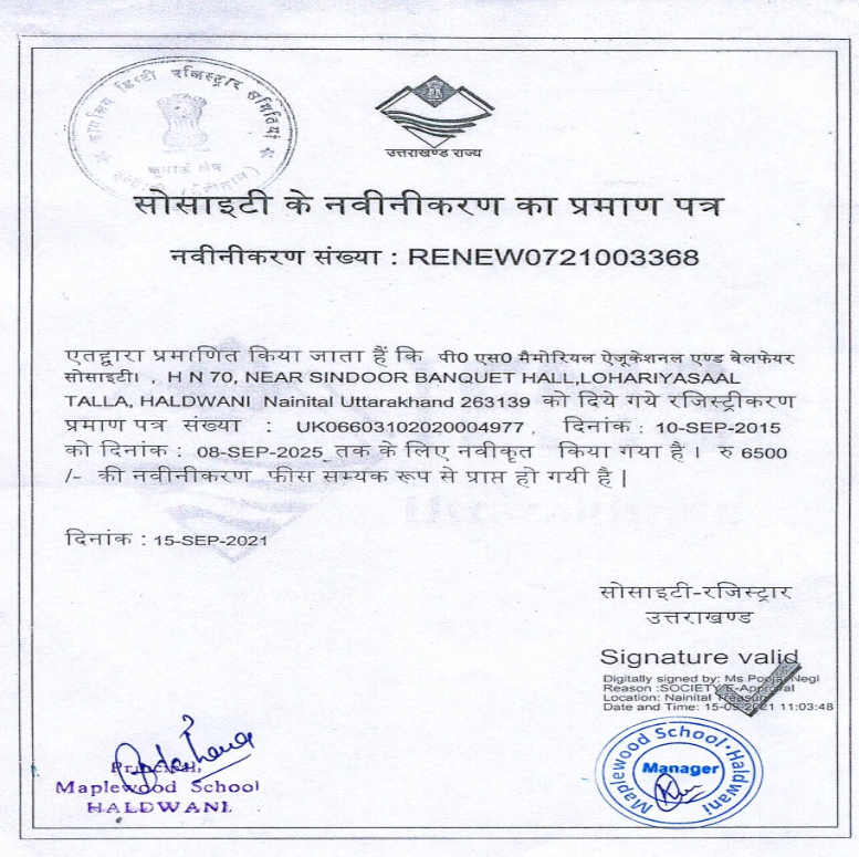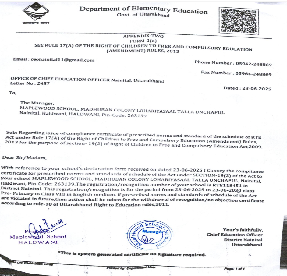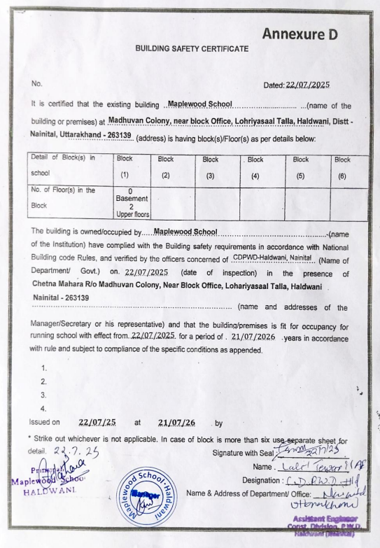 View and download the essential documents and certificates for MapleWood School Haldwani as per CBSE guidelines.